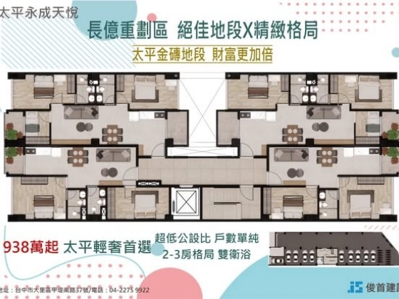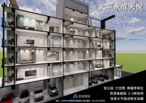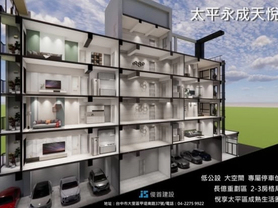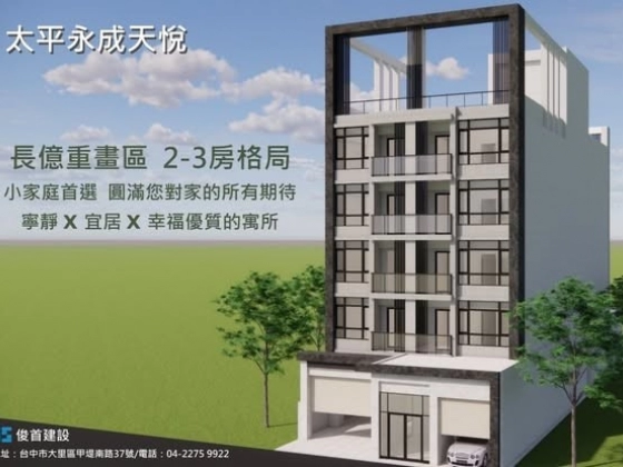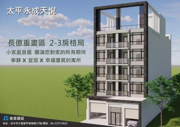 太平永成天悅太平區高CP值住宅登場!全新預售電梯華廈隆重公開。本案規劃為五樓高,提供市場主流的2-3房實用格局,是首購及換屋族的最佳選擇。 四大核心優勢:低公設比: 資金聚焦室內實用面積,告別虛坪困擾。電梯華廈: 提升生活便利性與品質。絕佳地段: 位於永成北路靜巷,鬧中取靜,生活機能便利。預售優勢: 享有優先選戶權利,把握增值潛力。立即卡位太平好房,開啟舒適新生活!